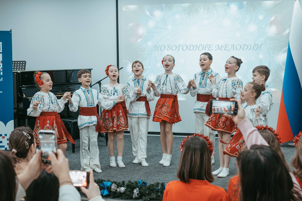 В преддверии Нового года зрителей, пришедших в Русский дом, встречали празднично украшенные фойе и актовый зал со сверкающими огнями новогодними ёлками. Взрослые и дети сразу попадали в атмосферу новогоднего волшебства, наполненную светом, улыбками и предвкушением прекрасного настроения, которое подарили им участники концерта.